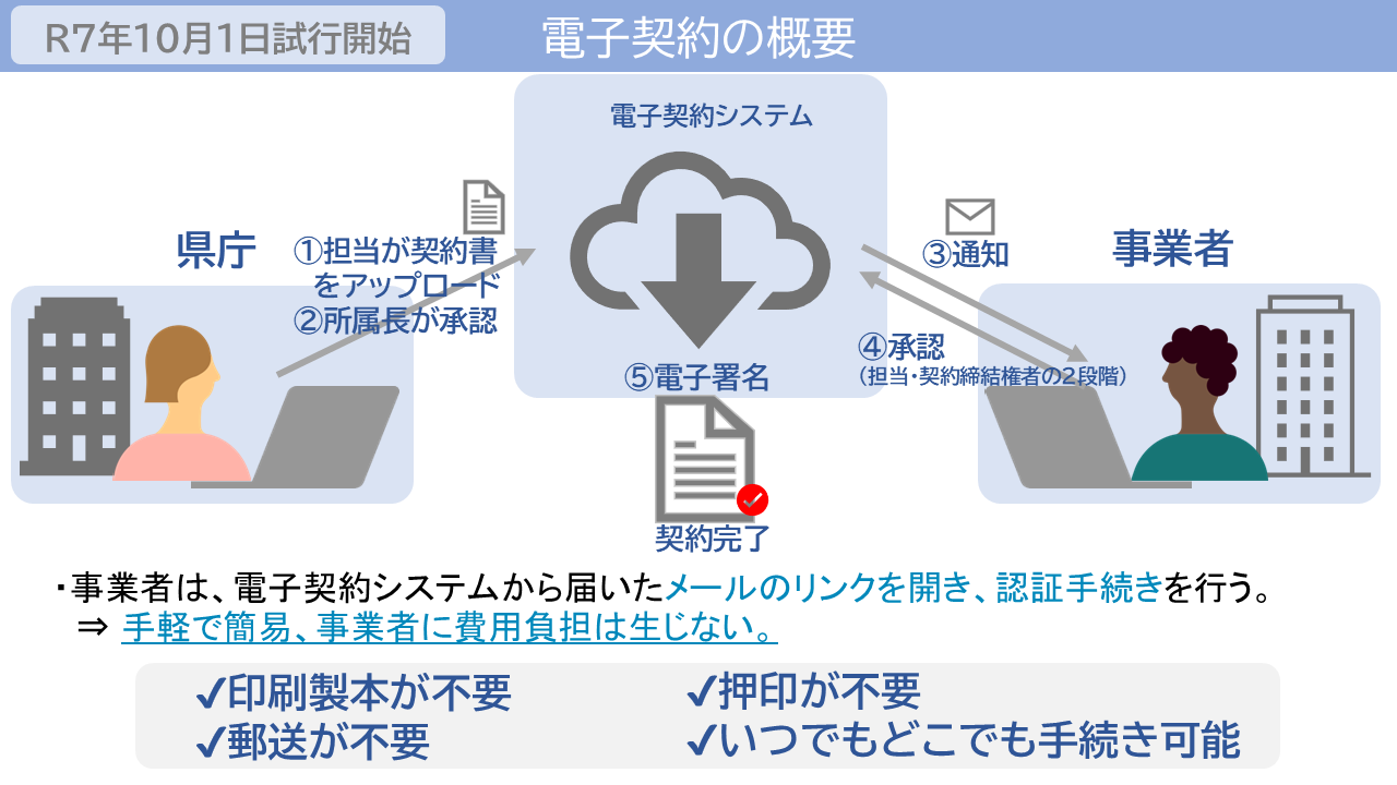 令和7年10月1日以降に入札公告をする一部の案件について、建設工事請負契約の電子契約を試行的に導入します。